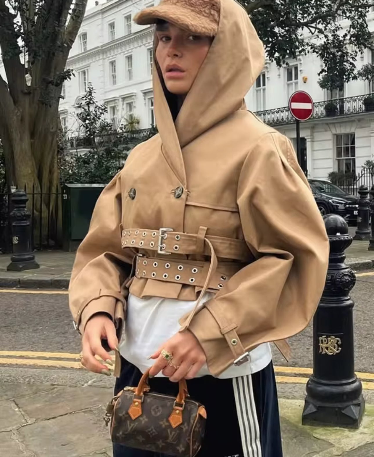 Equipped with a hood, this jacket provides extra protection against the elements, making it perfect for autumn weather.