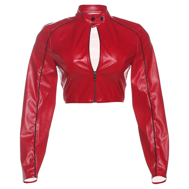 O Neck Zip Up Faux Leather Jacket. Cropped