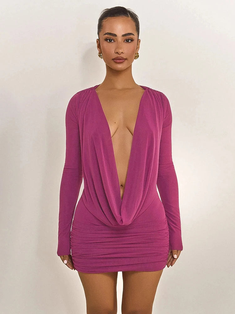 Pullover Deep V Mini Dress. Ruched. Stretch