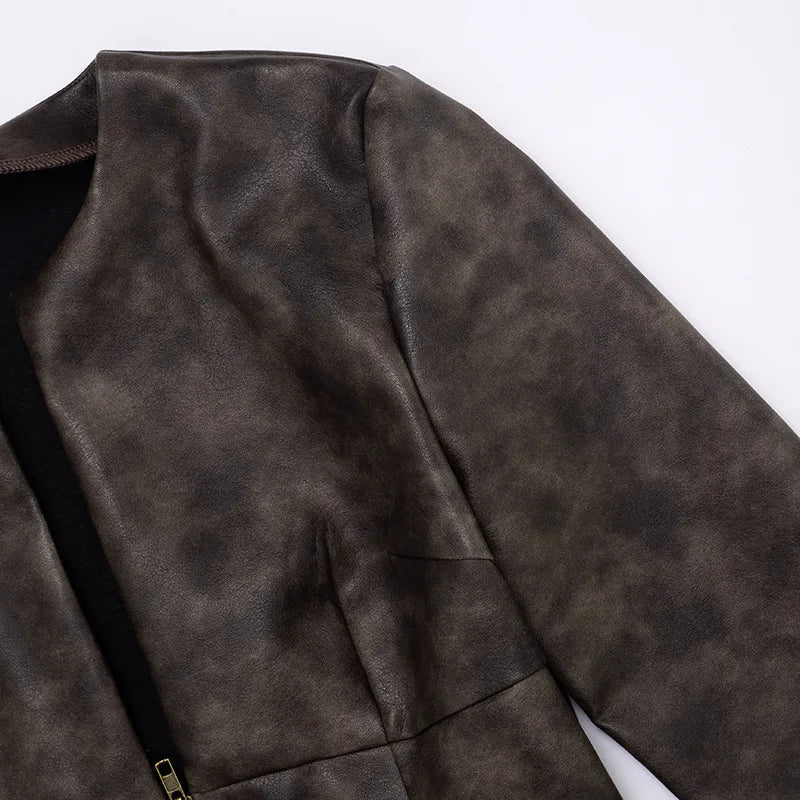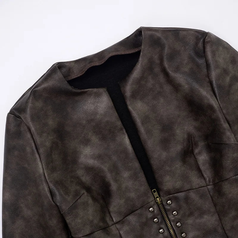 Deep V Faux Leather Zip Up Jacket With Stud Accents.