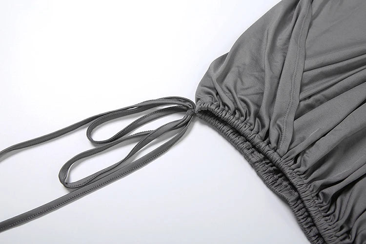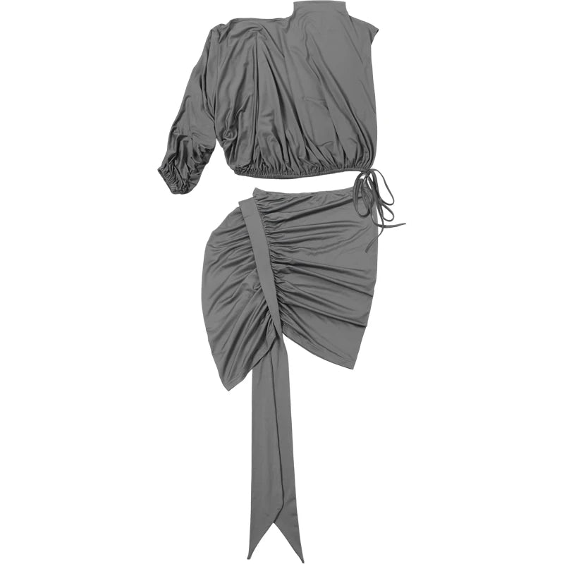 Sexy 2-Piece Mini Skirt. Irregular Shaping, One Shoulder Top. Ruched Draping Detail.