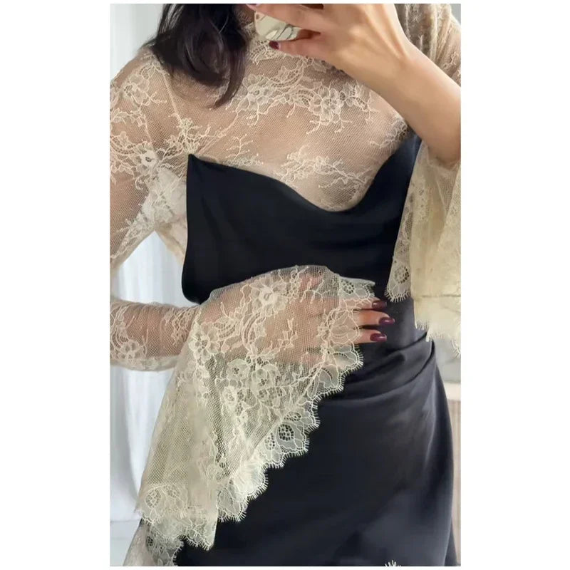 Lace Patchwork Sexy Mini Dress. Elegant Flared Sleeves. Waist Cinching Mini Dress