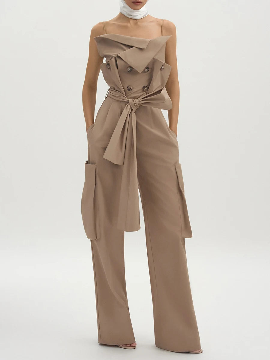Strapless Sleeveless Patchwork Lace Up Irregular Jumpsuit.